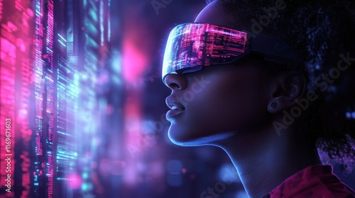 A profile of a person wearing futuristic VR goggles, surrounded by vibrant digital data streams.