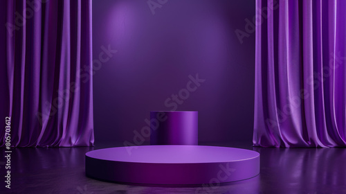 A purple room with purple curtains and a purple pedestal