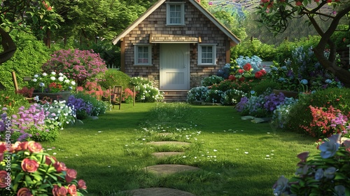 A quaint garden filled with colorful flowers, with a charming cottage peeking through in the background. Generative AI