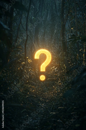 A question mark icon glowing in the darkness of a dense forest, representing an enigmatic journey or mystery.