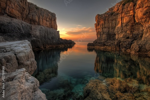 A quiet rocky cove surrounded by cliffs, its water reflecting the vibrant hues of the setting sun