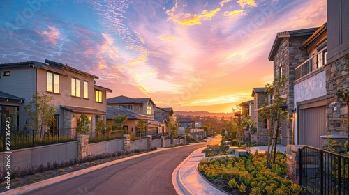A quiet suburban street lined with houses bathed in the warm glow of a sunset.