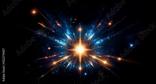 A radiant burst of blue and gold light explodes from the center against a dark background, creating a dynamic and abstract display of energy.
