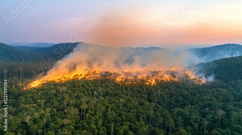 A rainforest is engulfed in flames at night, revealing severe forest destruction and erosion against the backdrop of a dark sky