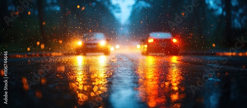 A rainy street scene with cars illuminated by lights, creating a moody atmosphere.