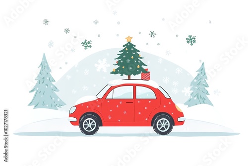 A red car with a Christmas tree on the roof, a flat design illustration, simple and cute. Vector art with a winter background