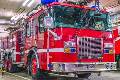 A red car with chrome body parts designed to deliver firefighters to the place of fire and to extinguish fires. Fire truck with retractable ladder for extinguishing fires at height.