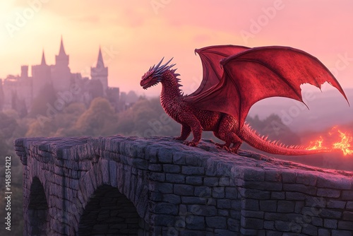 A red dragon standing on a stone bridge with a castle in the background at sunset or sunrise