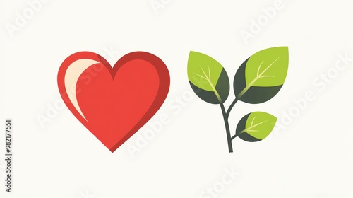 A red heart and green leaves on a white background.