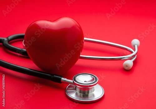 A red heart shape and a stethoscope on a red background
