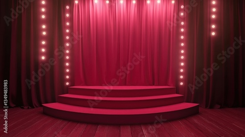 A Red Stage with Curtains Lit by Lights and Stairs