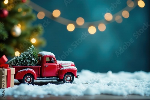 A red vintage truck carries a miniature evergreen tree through a snowy winter landscape, illuminated by warm string lights and a blurred Christmas tree in the background.