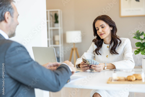 A refined business interaction where a woman assesses cash from a man, depicting the seriousness and professionalism inherent in financial discussions in a modern setting.