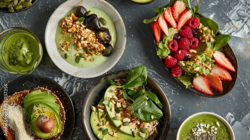 A refreshing and energizing breakfast platter featuring avocado toast acai bowls and smoothies all topped with a drizzle of nutrientrich avocado oil.