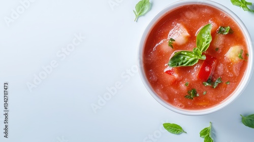 A refreshing bowl of chilled gazpacho soup garnished with fresh basil and diced vegetables sits on a light blue background offe a vibrant summer food image perfect for culinary