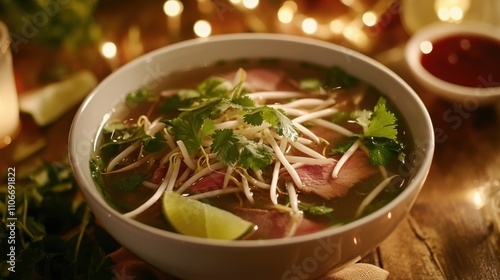 A refreshing bowl of Vietnamese pho garnished with bean sprouts, fresh herbs, lime wedges