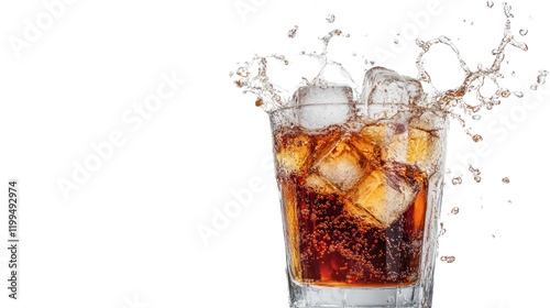 A refreshing glass of cola with ice cubes and splash, perfect for summer gatherings and celebrations against an isolated background.
