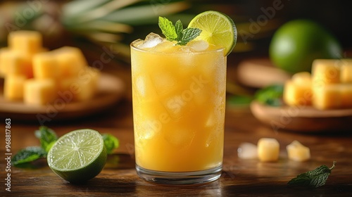 A refreshing glass of freshly squeezed juice filled with ice, garnished with lime and mint leaves