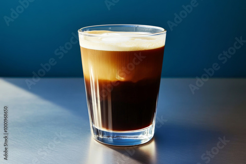 A refreshing glass of layered cold brew coffee displayed on a bright countertop in a cozy cafe setting during a sunny afternoon