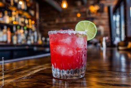 A refreshing margarita cocktail garnished with a lime wedge, salt rim, and served in a chilled glass on a rustic wooden bar top