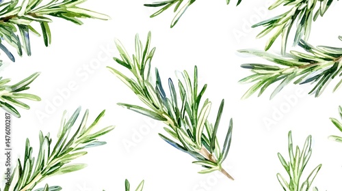 A repeating pattern of sprigs of rosemary on a white background.