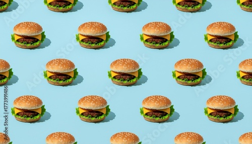 A repeating pop art pattern of cheeseburgers with lettuce on a solid light blue background, representing fast food culture.