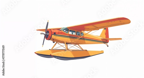 A retro seaplane with twin floats vintage design and orange yellow color scheme on plain white background