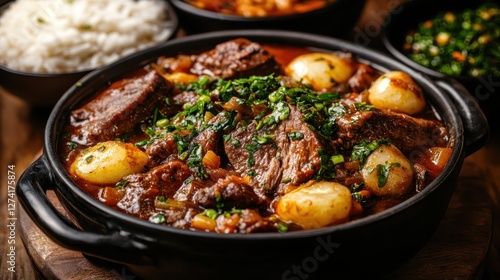 A rich and hearty beef plate adorned with potatoes and fresh herbs, radiating comfort and warmth, perfect for a cozy family gathering or festive occasion.