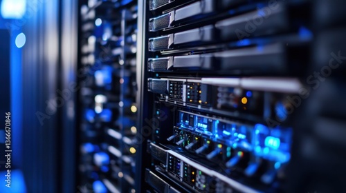 A robotic arm in a high performance computing center, assembling servers with AI precision for cloud data storage systems, IT-tech style