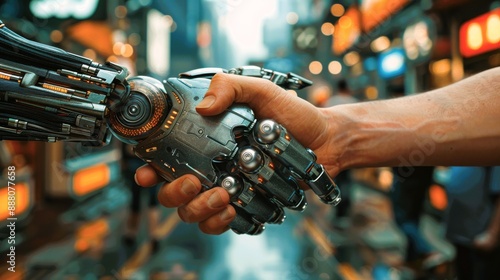 A robotic hand and a human hand shake in a futuristic cityscape, symbolizing collaboration and the future of technology.