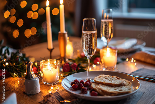 A romantic dinner setting with champagne, candles, and beautifully arranged table creates warm and intimate atmosphere. soft glow of candles and fairy lights enhances mood, perfect for special occasio
