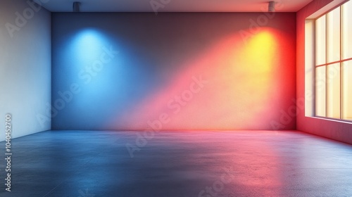 A room with blue and red lights on the wall. The room is empty and has a modern feel