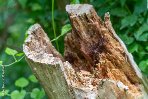 A rotten, broken tree stump stands in the greenery. The weathered structure shows different wood colors