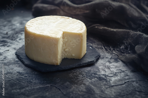 A round cheese wheel with a slice removed, resting on a dark slate background.