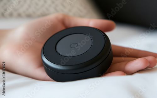 A round mental health tech device with a sleep tracker in a woman hand close-up.