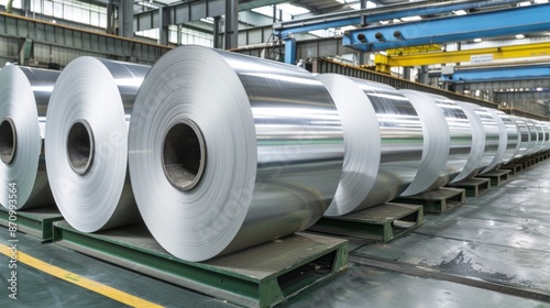 A row of aluminum rolls, freshly produced and ready for use, sit on a platform inside a modern factory