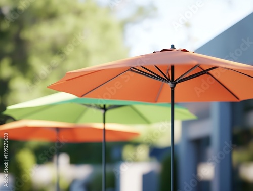 A row of colorful patio umbrellas provides shade on a bright summer day