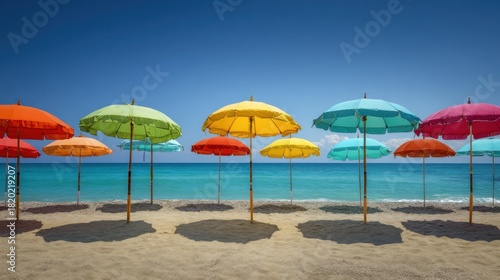A row of colorful umbrellas on a sandy beach, with a clear blue sky and turquoise water in the background.