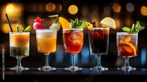 A row of drinks with a variety of flavors and colors. The drinks are in tall glasses and are lined up on a counter
