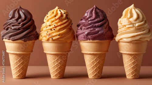 a row of five ice cream cones with chocolate, vanilla, and chocolate sprinkles on top of them.
