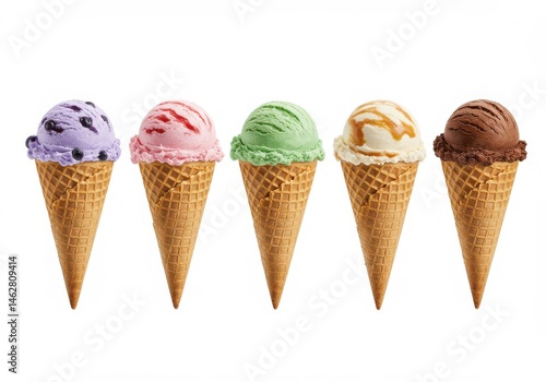A row of five ice cream cones with different flavors on a white background in a studio shot style