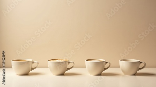A Row of Four Coffee Cups with Latte Art on a Neutral Background Displays Simple Elegance
