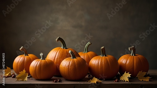 A row of orange pumpkins of various sizes with green stems, placed on a wooden surface against a dark background, interspersed with scattered yellow autumn leaves and small brown nuts