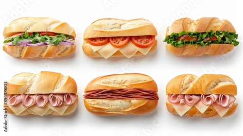A row of six different types of sandwiches, including ham and cheese, tomato and lettuce, and tuna salad