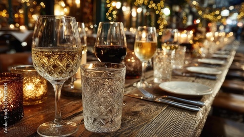 A row of wine glasses on a wooden table, celebrating warmth and togetherness