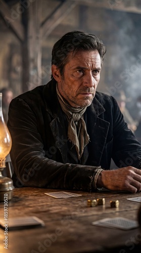 A rugged man sits at a wooden table with playing cards in a dimly lit, old-fashioned saloon.