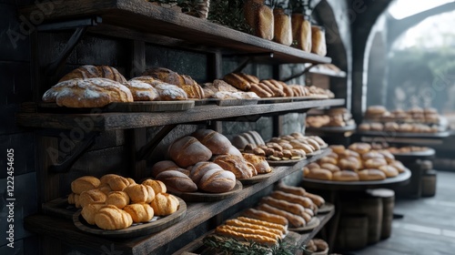 A rustic bakery with shelves filled with freshly baked bread and pastries.
