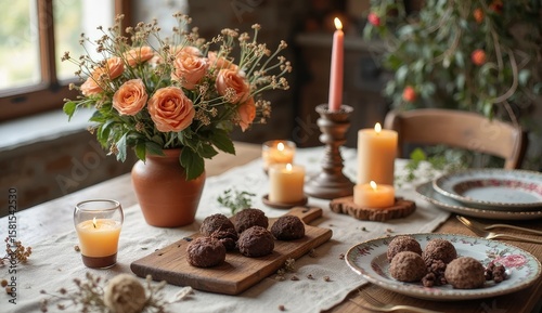 A rustic table setting with roses candles and chocolate truffles creating a cozy atmosphere indoors
