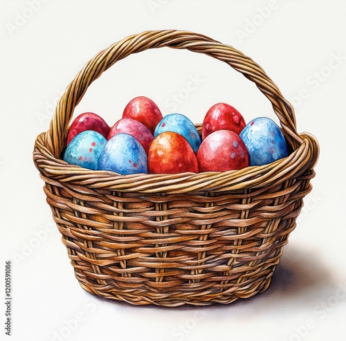 a rustic wicker basket filled with colorful Easter eggs in red, blue, and yellow, showcasing a festive and cheerful charm.