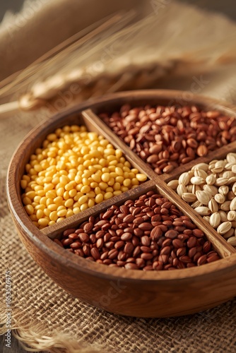 A rustic wooden bowl divided into four sections, each filled with different grains and legumes, placed on burlap fabric with wheat stalks in the background, symbolizing agriculture, nutrition, and nat